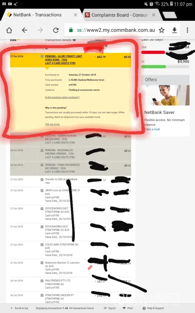I have been charged $91.62 TWICE 2 minutes apart on the 4th May on my CBA Australian credit card in the name of Jennifer Laird