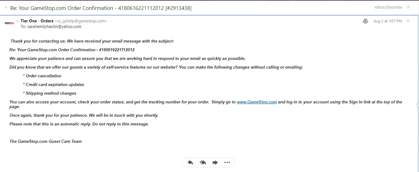 "Thank you so much for pre-ordering Call of Duty: Black Ops 4 from GameStop! Your order # is going to be in your hands before you know it!