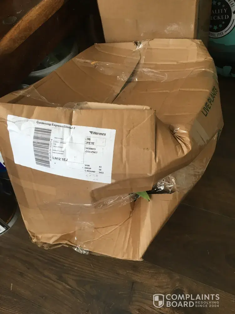 After waiting the best part of three weeks for my £82 order, it arrived last Saturday in an appalling condition. Two of the boxes looked like they had been run over. I immediately took several photos and emailed Gardening Express through their website. After hearing nothing for about a week I messaged via Facebook. What I got back today was their standard reply saying I had to return them at MY expense so they could inspect them. The packaging was destroyed in transit so apart from the additional cost, I would have to source some kind of packaging. Also, going by other people's experience the chances of a replacement/refund are zero. They are still continually adding items to their Facebook page but interestingly there is no review page and any negative comments are deleted immediately. The only clue to people's dissatisfaction is the amount of angry faces in the 'likes'. How can this company get away with this, don't we have laws in the UK to protect us?