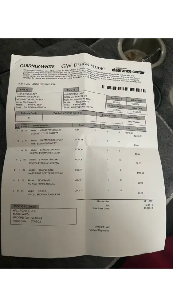 On July 3, 2022 I purchased a Sterns & Foster Lux Estate Cassatt Mattress from Salesperson Mike Whidden at Gardner White Furniture located at Hall Road Store, 45300 Hayes, Macomb Twp, MI 48044.