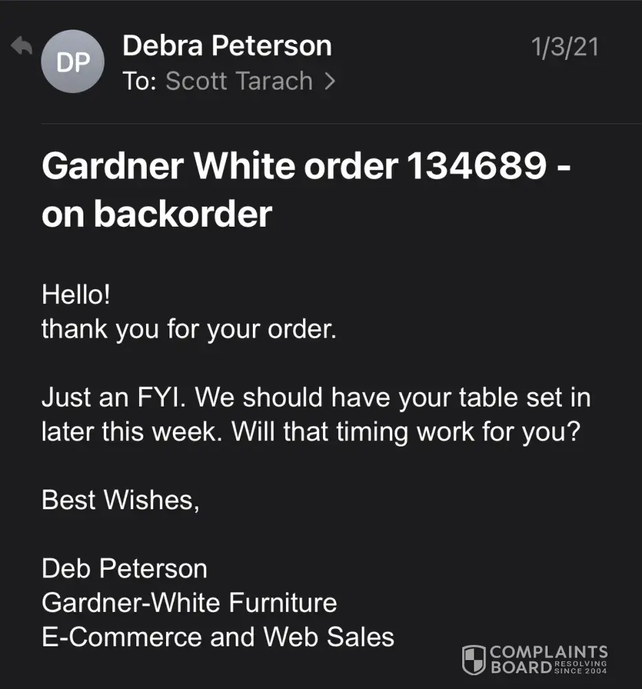I ordered a dining set on 01/02/2021. I was sent an email on 01/03 informing me that my set would be arriving later in the week. Another email on 01/05 stating it will be inspected and then we set delivery time and it's shipped out for a "white glove delivery". I started getting auto-emails, including a Track Your Truck email. I called customer support Mon 01/04, the GW Team member told me they would deliver and assemble it as White Glove process, that he saw my order and that it would be in later in the week, once arrived and checked in, I would receive a call for a delivery time. I hear nothing by Fri 01/08, so I email GW asking for an update on 01/09, a response comes back on 01/11 informing me that I am not getting my set, "sorry". In the week I waited, I gave away my dining room table to make room for the set I was told was coming later in the week. My family now has no place to sit down to dinner, and in Michigan, we can't even opt for a restaurant table. I emailed the contact at GW back wondering what they were doing to help resolve this deficiency and or retain my business? She responded with, "I'm refunding you, see attached... Best wishes" The experience and her emailed response could not be more frustrating, inconvenient and insulting.