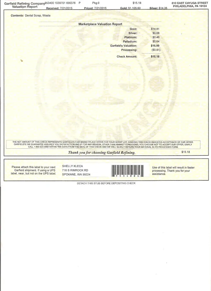 I also was ripped off by Garfield refining and I would advise consumers to stay away. This company was recommended to me by my dentist who pulled a 22k gold molar out of my mouth. I took my tooth home to show my kids and they said "how much will the tooth fairy give you for that tooth?" I said I had no idea, so I went into a pawn shop where I was offer $54. My kids were so impressed. I put the tooth under the pillow, left myself some money and shipped the tooth into Garfield Refining figuring I would actually get a little more than $54 since Pawn Shops low ball things. Weeks later I received a check for $15.18! I was obviously not happy about this and told them I had the paperwork showing it was a 22k gold tooth. They offered to ship the metal back to me, which of course I didn't trust them, if they were going to cheat me so badly with the value, who knows what they would ship back to me. I STRONGLY RECOMMEND NOT USING THIS COMPANY. THEY ABSOLUTELY CHEATED ME. I have reported them to my Dentist and now to the better business bureau. Your dentist will tell you how much gold is in your crowns - companies like this should be avoided, once you mail your valuables in, they have you, and they know it.