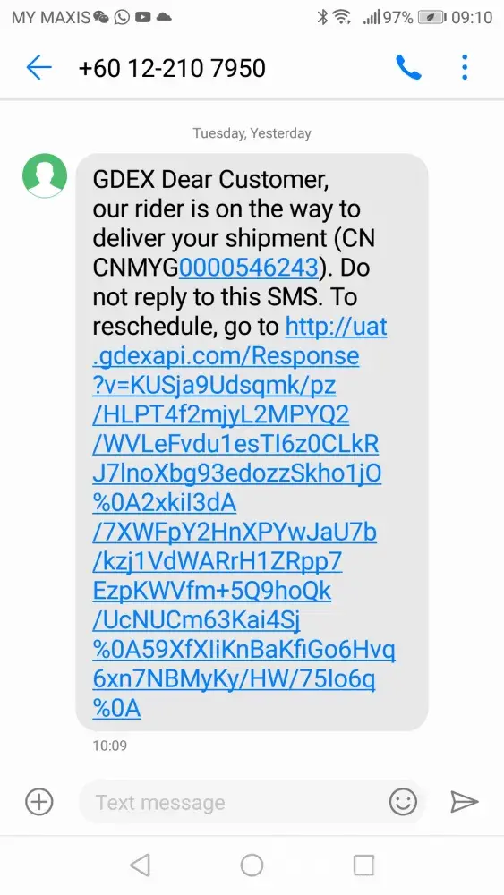 I got the msg from this phone number (10:12am) saying that the parcel is on the way delivery & he called me afternoon 2:04pm & told me he do not know where the place is. As I know all the courier service are normally allocated to some same people for the fixed area to deliver document & parcel & he refuse listen to me how to get the place & keep telling me he DO NOT KNOW where the place is.