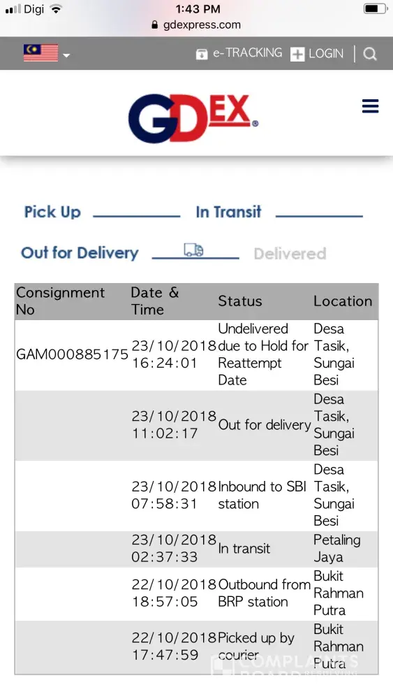 This is not the first time gdex caused me problems. last time I ended up driving to the depot myself to collect my parcel. again, the delivery failed miserably, after several attempts. that time the excuse was that my parcel was too valuable to leave with the guardhouse. they do not trust my guards? well, I do. that's why they work for me. my thanks to the kind staff at the depot, they helped me and located my parcel, even though it was late in the day.