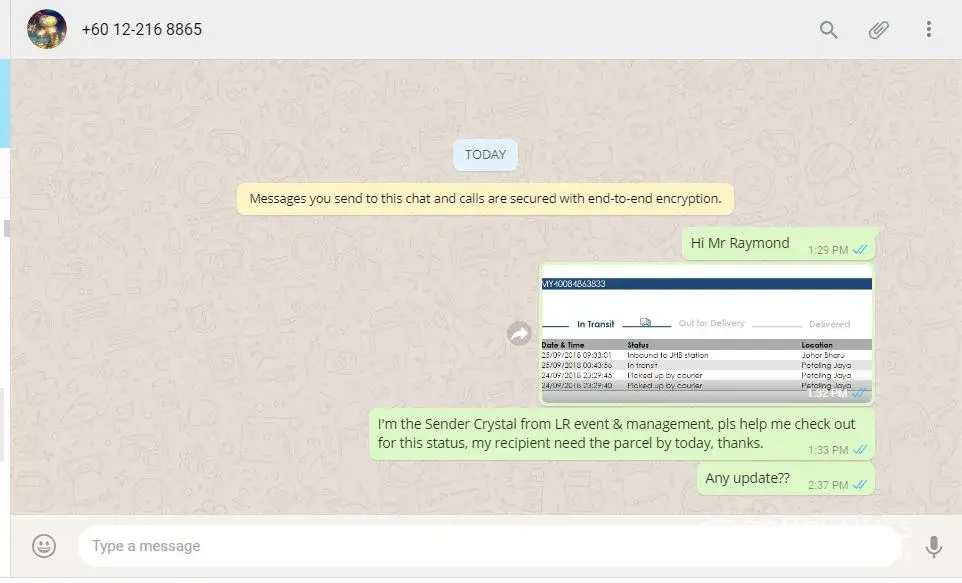 3. Delivery guy never give me a call when they on their way. I was in the way back home when they arrived my home. If they could give me a call then i wouldnt need to miss my parcel.