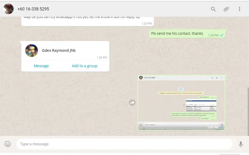 On 21/9/2018 morning 9.45ami receive the customer service day my parcel have damaged, so inform me my parcel I canot receive... So I arrange the sender courier co. From china to contact gdex staff...