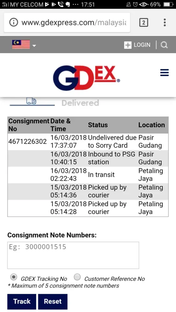 On the 2nd of March, I received a "sorry" note, asking me to collect the parcel at their branch. Also written on the "sorry" note, was also the date of "an attempt of 2nd delivery", which was written "2nd of March" as well. I dont always receive parcels with Gdex so I thought the 2nd delivery was made on the same day. On the 3rd of March, I drove from home, all the way to the Gdex Kuching branch, only to be disappointed, and even more disappointed with the custome service I was given. The male clerk did not at all offer an alternative or slight of help to the situation, and only said to come back the following day to pickup the parcel, at the Kuching branch, which is ridiculously far from where I'm residing. Tho the male clerk called the dispatched delivery unit to confirm his whereabouts, but resorted to giving me the sorry note because no one was at home. I don't think it is my fault that I'm not at home for the 2nd delivery. Clearly, the dispatched delivery unit should take heed the information they jote down on the SORRY note