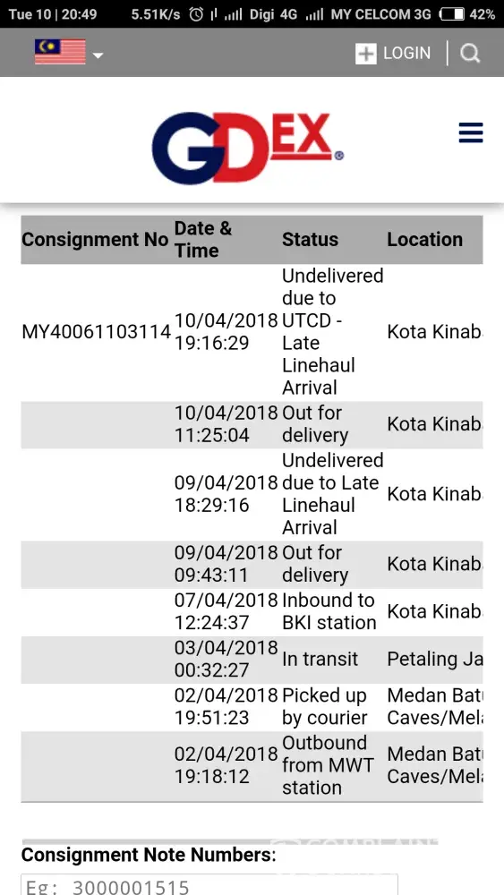 31/03/2018 : Inbound to MKZ Station (as per mentioned in your e-tracking portal) and from this date until today (05/04/2018) there is no delivery has been made. How long you want to keep the parcel? I've never experience this bad service from GDEX Kuala Lumpur Branch. But GDEX Melaka was very disappointed!