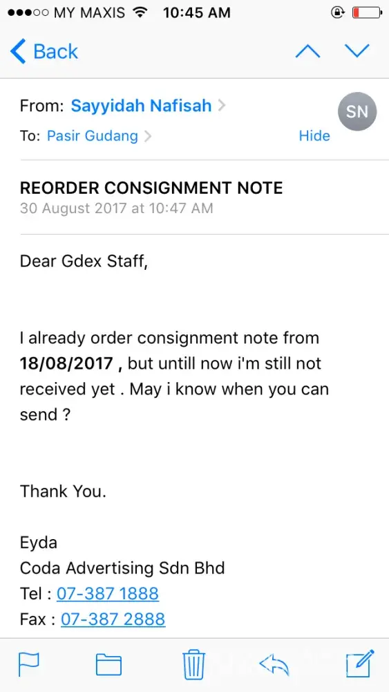 On 18 August i have order consignment note (acc. no : 3012795) but no one Psg staff reply my email . So i direct call office to order . i call so many times everyday but no ones pickup my call untill today . last week 30 August and 13 Sept i reorder again but still no one reply my mail and untill now i'm not received my consignment note . Almost 1 month and now my consignment note already finish . So how i want do my job . All document really urgent must send to my client . how i can send if i dont have consignment note ! Please do something !