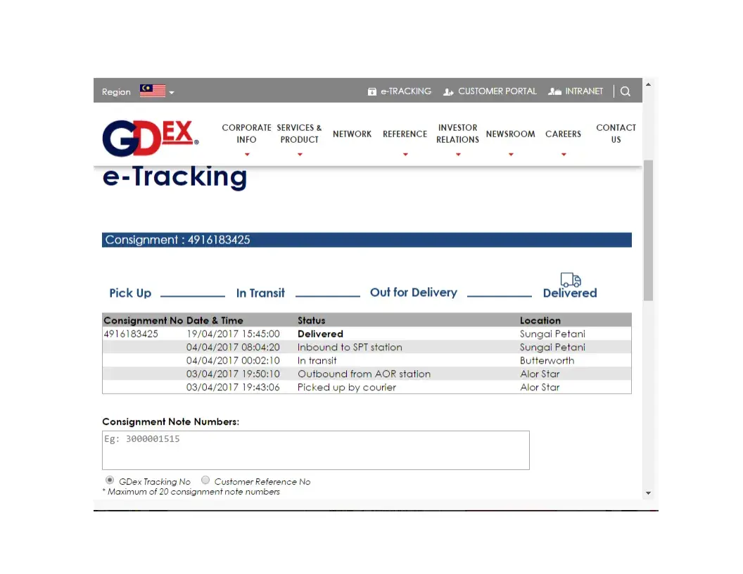 GDex, also known as GD Express, offers courier delivery services primarily within Malaysia. They provide parcel tracking, same-day delivery, and logistics solutions for both individual and corporate clients. GDex also extends international shipping, handling customs clearance for cross-border transactions. Their services cater to a range of delivery needs with options for different time frames and package sizes.