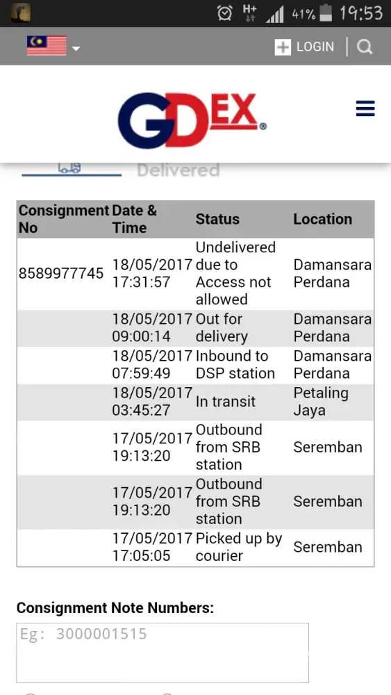19/05/2017 18:49:09 Undelivered due to Hold for Reattempt Date Petaling Jaya