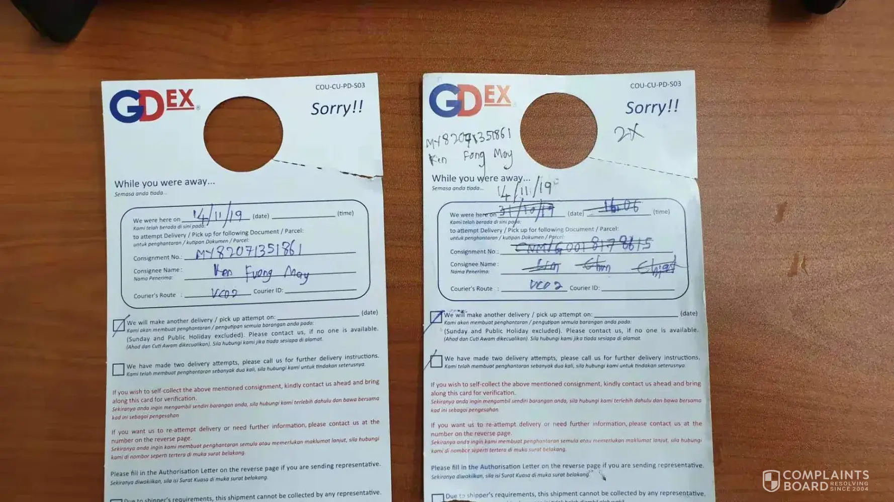 Despite called up to customer service on Nov13 requesting not to deliver parcel at the specified time (12pm to 2pm) but I've still received from GD Express notice to inform that the delivery was made at this period while I'm away for lunch...Hence, I'm not sure how difficult that GD is able to address for such a simple request ( prefer delivery time has been stated in GD Exp system on Nov13) ? Looking for your prompt response...Have a great day?