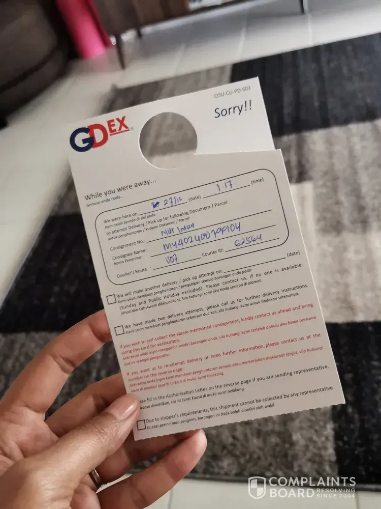 This afternoon I received a call from GDex and said they already arrived at guard house. I also already at guard house, but I didn't see any GDex truck. After questioning then only realized they were at another house of mine which is just one junction far away. Then I told them I will arrive in within 1 minute. Please wait. Then the deliveryman answered in...