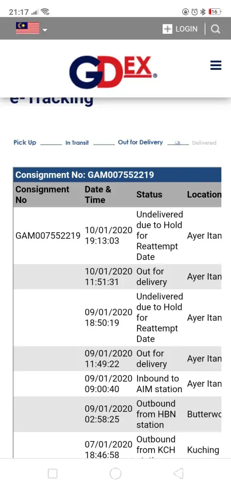 The e-tracking shows that my parcel GAM007552219 has been out for delivery since 9th January 2020 but the parcel is undelivered due to Hold for Reattempt date. I have been staying home to wait for the delivery for two consecutive days already and have wasted two days. What sort of express delivery service is this? Because you sent me message alerting me that a delivery is forthcoming I therefore stayed home to ensure that you would not be wasting a trip. I ended up wasting two days.