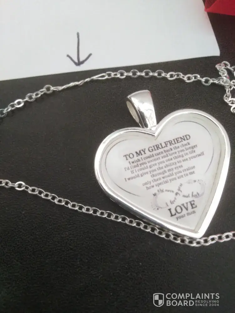 When I first got to see this add on my Facebook page, I was honestly taken back on what was written on the heart! I just received the necklace today and could't be more disappointed! You can't even read anything written on the heart without a good magnifying glass, being it is written THAT small! I tried calling to complain, but they aren't taking anymore phone calls anymore! With the [censored]ty rating this company has and the amount of complaints, than it makes perfect sense to my why they don't pick up the F-ing phone This company sucks and scams you to buy from them!