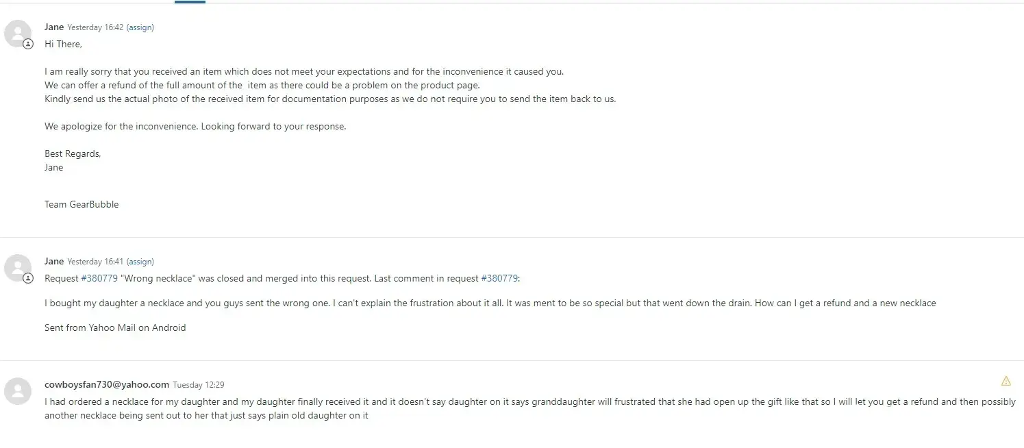 I've been trying to get ahold of you guys for almost two weeks now. I've been sending you guys emails and I get e-mails back saying that you guys had closed my request twice all I want is for you guys to send a new necklace to my daughter and I want a full refund. I ordered the necklace saying to my daughter and you guys end up sending her a necklace saying it was from a grandma what is it going to take for you guys to respond to my emails and my request I don't really want to try to get a lawyer involved because you guys don't want to respond and take care of your customers