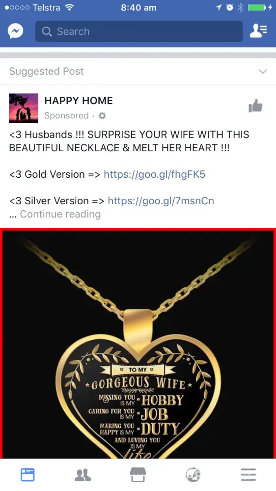 Purchased necklace to give my husband on Valentine's day. Picture portrayed on Facebook is NOTHING close to what I received. Very poor quality, appears to be made of plastic not metal. I tried contacting then via email inquiring delivery date. No response for 2 weeks. Spent $40.00 for something that could have been bought for $5.00 at discount store.