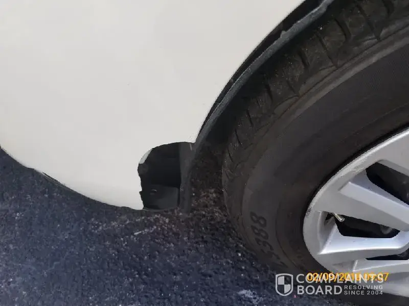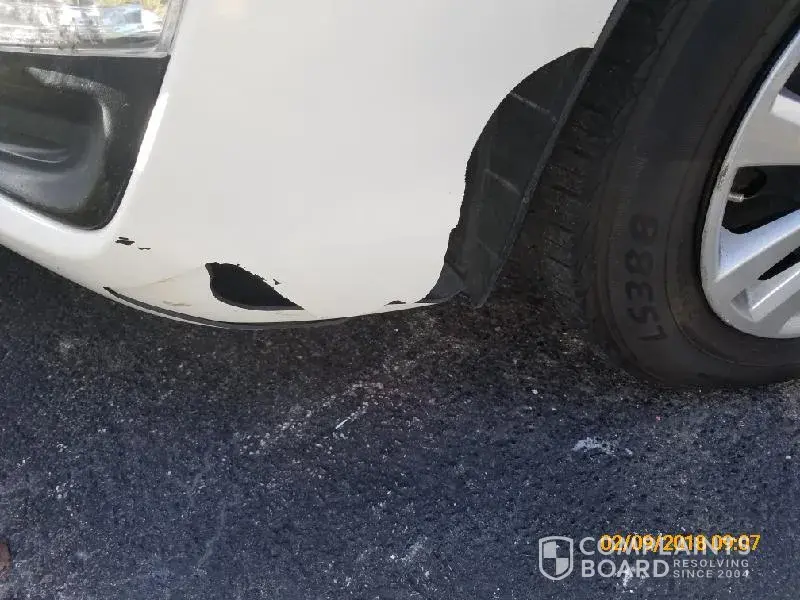 1) Car: rear bumper with visible several minor dents and multiple horizontal minor cracks, with its right side detaching from the body by 0.3 inch; unknown damage beneath