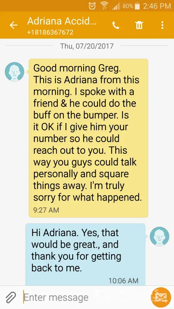 Now, its almost been 4 months, and the claims agent I deal with is unreal! Never answer's, never calls back, and when she finally did...she tells me, "Well there's nothing I can do if she doesn't answer. I have to talk to her to get her side of the story." Of course shes not going to answer? Are you kidding me? My claims agent tells me that she needs more proof. I have the damage to my car, the text messages, the witness, plus it happened at HER PLACE OF BUSINESS. She was told to go home because she was wearing the wrong shoes, jumped in the car, backed out, and scraped/dented my brand new car; which was parked right next to her.