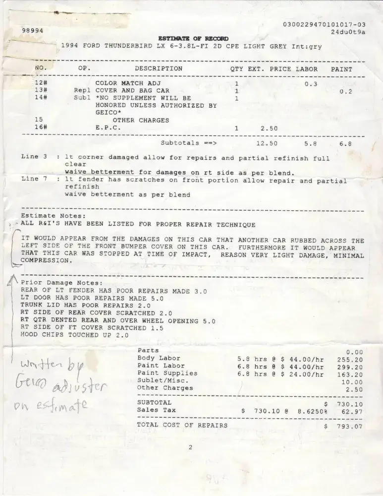 I recently had a Geico insuranceholder hit my car. The windshield is cracked, hood dented, hood ornament gone, front grill ruined and some other damage. The car is a 1995 Jaguar XJR. Geico customer servie told me I needed to get the damages figured so I had it taken to Royal Body Works. The quote came to about $3, 800. Geico told me they would not use that quote and they would send out one of their adjusters who figured the damages at $1, 800.00. They sent a check without even speaking to me. I have not cashed the check and I am VERY upet that they are telling me it will only be $1, 800 as it will be much more than that to fix. I will be out and extra $2, 000.00 because I got hit by a Geico insurance holder. I do not think this is fair.