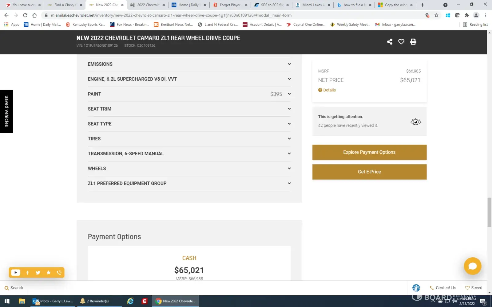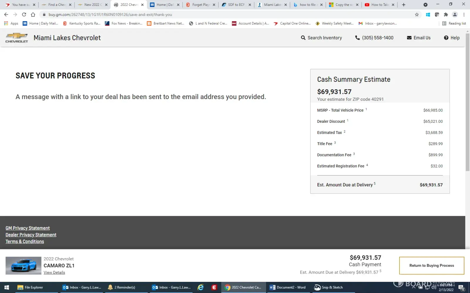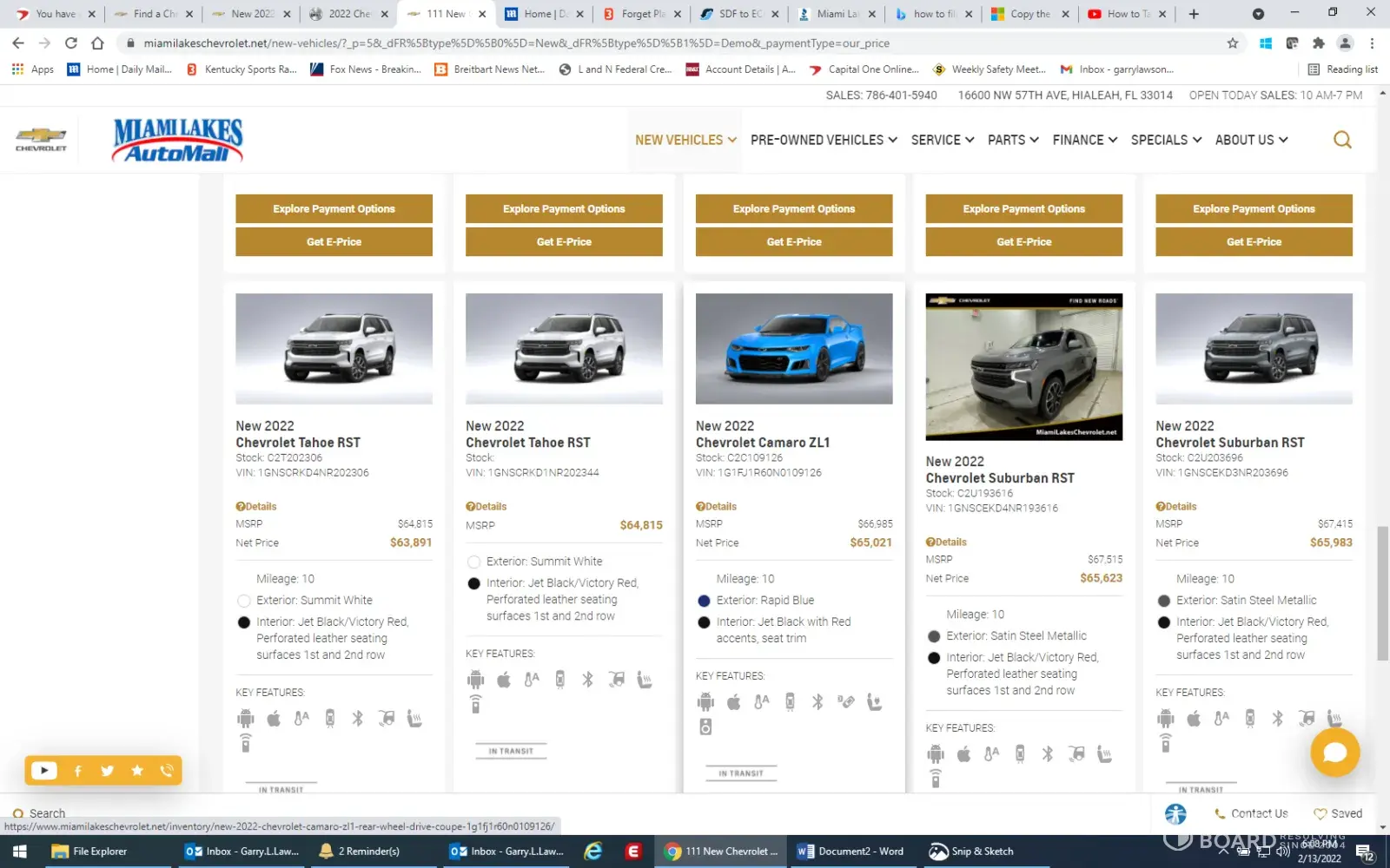On Sunday 2/14/22, I found a 2022 ZL1 Camaro for sale on Autotrader at Miami Lakes Chevrolet. I went to Miami Lakes website, it showed MSRP, as well as a discounted amount (see attached screen shots). I also went to a calculator based on Miami Lakes price, and had it calculate price with taxes. I forwarded email to Miami Lakes, with my information, saying I wished to purchase the car. I then received a call from Adam Marcus Internet Customer Relations Manager, who informed me that was not the price of the car. He told me it was $10,000 more, which I said that is false advertising. He then transferred me to another sales rep(?), who did not give me his name, he also told me that the price was 10 to 15, thousand more than advertised. I also responded that this was not the advertised price. I asked him why, which he could never give an answer for. He kept changing the subject to shortages of ZL1s, we can sell the car at whatever price they wanted to, car was in transit, which I kept bringing him back then why was it advertised like that on Miami Lakes site. Which he could not ever answer. I hope GM does not condone this type of false advertisement of their product. All other dealers I have looked at either say, price increase over MSRP, or contact dealer for adjusted price, which is the way this should be handled, not advertising in a false manner. I hope GM will reprimand Miami Lakes for poor and actually illegal activity when it comes to advertising. Thank you for reviewing this