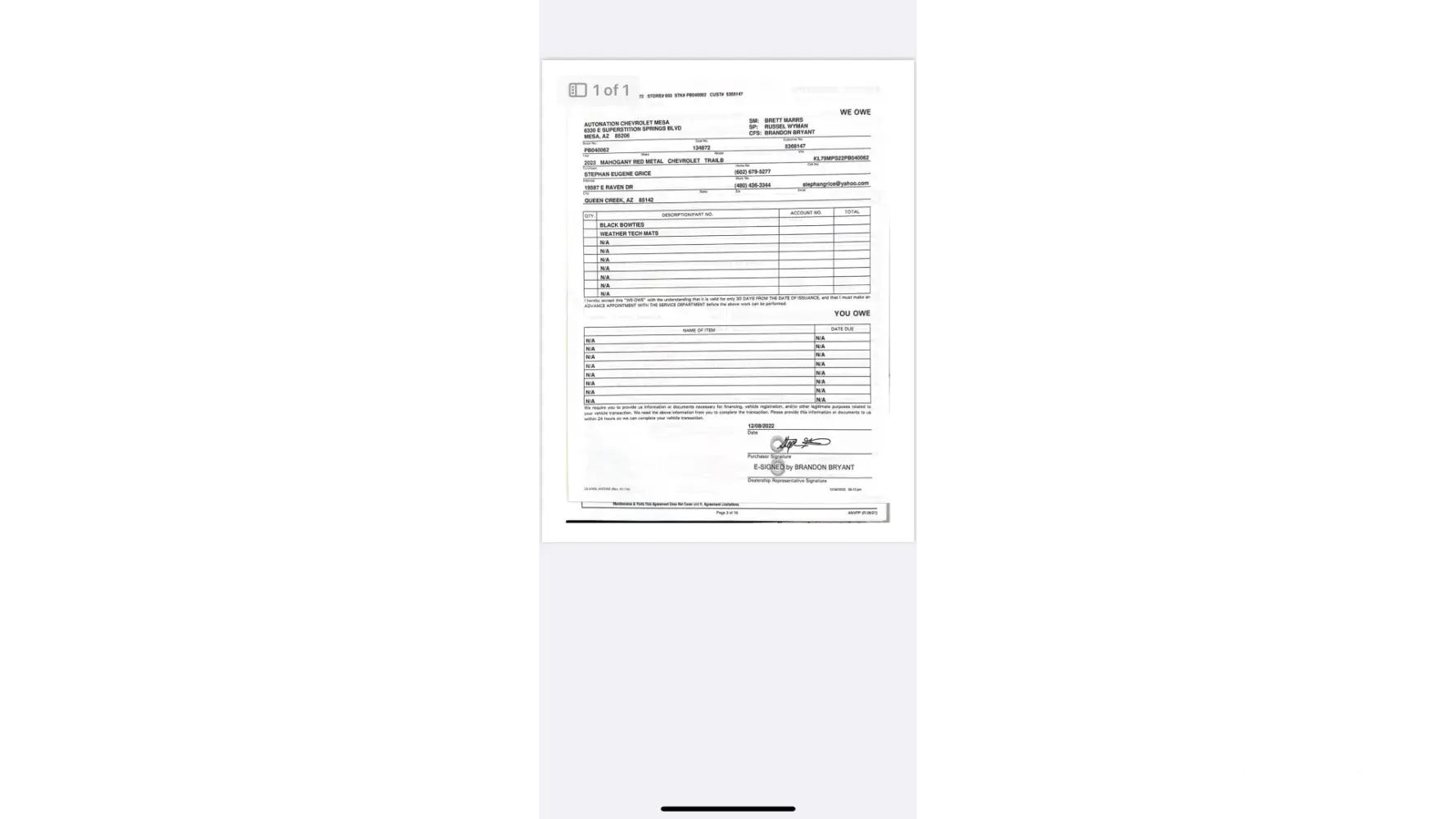 In December of 2022 we purchased 2 brand new vehicles (2023 Blazer and 2023 Trailblazer) from Autonation Chevrolet Superstition Springs from Russel Wyman (Salesman), at that time we were told that they were ordering us Black Bowties for the front and back of both vehicles, and Weathertech floor mats and rear cargo areas for both vehicles too. In February of 2023 I reached out to them, I was told they would now order them, April 2023 I reached out again, said they weren't in yet, May 2023 I reached out again and said they would be here in a week, July 30, 2023 I reached out to the Manager of the dealership (Shane Wolfe), he said it would be taken care of, I received a few emails over the next week or so, then I reached out again on October 8, 2023 and I have not heard back on the matter at hand, now every time I email any of them, I get an out of office automatic reply. In the first week of December, this will have been going on for over 1 year, I am including the paperwork on the owed items for the Trailblazer, but I can't seem to find them for the Blazer (It's been almost a year). I hope this can get resolved in a timely manner.