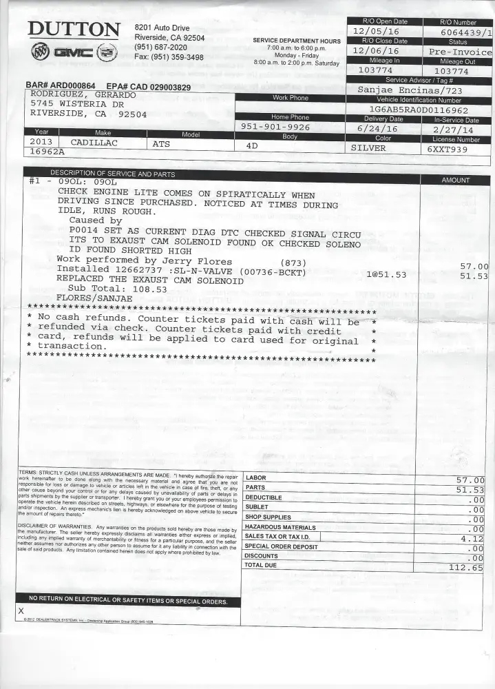 I purchased a used 2013 Cadillac ats from one of your certified dealers in Riverside California on June 24th 2016 under the impression that the car was in good functioning condition, shortly after owning the car I started to notice it would smell like coolant and would sputter while driving almost as if it were on the verge of stalling or cutting out, when I took the car into the dealer for an oil change they informed me that they could not find a leak in the hoses and the car was fine and these engines just ran rough, the coolant smell continued and soon I would sporadically see the check engine light turn on, on 3 different occasions I had called and informed them the check engine light had come on and they told me to bring it in, the only problem would be that after a few hours or sometimes a day or two the light would turn off before I could take the time off work to take it in while the light was on as I was told nothing could be done if the light wasn't on, on 12/05/2016 the check engine light turned on and I called off work to finally attempt to fix this problem, I was informed it was an exhaust cam solenoid and that was replaced under ally warranty, the problem continued and even got worse after the replacement of the solenoid because soon after that happened I started to notice it would eat more coolant and the coolant would bubble in the reservoir overflow, when I took the car in again for an oil change I informed them and they told me that happens when the coolant level is low and If I added coolant it would fix the problem, I stayed on top of the coolant issue and the bubbling did stop for awhile but I noticed the overflow would fill up to the top and not re empty out when car would cool like in previous cars I have owned, I continued to drive car until it finally overheated and I had to stop and wait for the car too completely cool down, I took car back in on 2/17/2017 and told them the problem with the coolant had gotten worse and asked them to run a test to see if it was a blown head gasket or a leak in the cooling system that has been causing the problem, I was informed that the car had a crack in radiator on the bottom right side and that was causing the coolant leak and the bubbling in overflow and it would be a 1300$ fix, it didn't make sense to me because the way the coolant was disappearing it would have had to have dripped on the ground when parked and ive never seen a puddle when id park the car. I took the car to a shop half a mile from my house and they informed me the car did have a leak but not where the dealers compression test had originally shown, the car was leaking on the top left hand side of the radiator not the bottom right as they had informed me at the dealer, i had to pay 900$ to get it fixed. i got the radiator replaced and topped off with coolant and yet again i noticed a significant drop in the coolant level but was told by the dealer to test drive the car and to take it back to them if it continued and that theyd only charge me half the amount they usually do to diagnose it. i drove the car for two days while carefully monitoring the gauges for any inconsistency, on Saturday morning a little past midnight the car sputtered and completely died out throwing up the check engine light, abs, traction control and a few other things all at once, when i attempted to restart the car i realized i had no control over anything electrical in the car and the brake and gas were stiff and i was unable to shift into neutral to move the car to a safer position. The car was towed to a nearby dealer where i was told by the service technicians that my motor had completely locked up and they cant seem to figure why, they told me they originally believed it was an electrical issue but after testing it the starter, alternator & battery appeared to be fine. after extensive research on forums and complaints about the car i found that i was not alone and this has happened to multiple people with the same car with the end result being a motor replacement or dealer buy back, i then got an uber to the dealer i originally purchased the car from in an attempt to get them to fix, trade or buy back the car because it was faulty from the beginning and the car fax even showed multiple visits to the dealer by previous owner for engine idling and to get cooling system checked all of which i was told was "basic maintenance" when i originally asked if the car had any issues before buying the car in the first place, they told me there was no proof and the most they could do would be to pay half of the cost to have the dealer where it is currently at inspect it unless i had it towed to them myself out of pocket($560) and they would inspect it themselves, i don't see why i would have to pay to get the car fixed when i have done my part as the owner to inform them of the issues and take the time off to bring the car in for them to not do a thing about it, this is a well documented issue with these cars on online forums with multiple people complaining about the same thing, i have kept my cool throughout the entire process because i love the car and my family has owned multiple gm vehicles but it is really disgraceful that even when providing them with proof of the problem and even examples of it happening to other vehicles of the same kind i get blown off and left 20+ thousand dollars in debt for a car that was sold from a certified dealer, this type of behavior would be expected from a random scammer on the street but not from one of your certified and well known dealers. i would have been happy if they took the time to actually look at the problem and what other dealers did to fix it but even after showing them profit was a common issue but i was blown off, i really wish someone at a bit higher level would reach out and help me resolve this issue, i still love and believe in GM's quality of vehicles but i know that not every car off the production line comes out to expectation, i feel a 