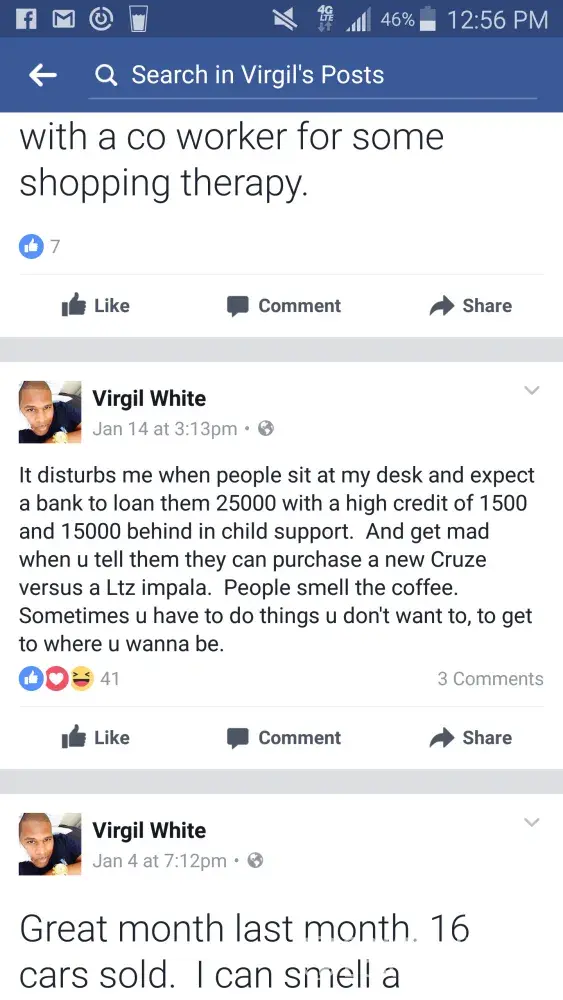 Later that day, it was discovered that not even 30 min after us leaving the dealership Mr. white deemed it appropriate to post to his social media how" disturbed he was with us and our situation and that we should wake up and smell the coffee" Mr White also placed specific details from my husbands file to describe his disturbance.