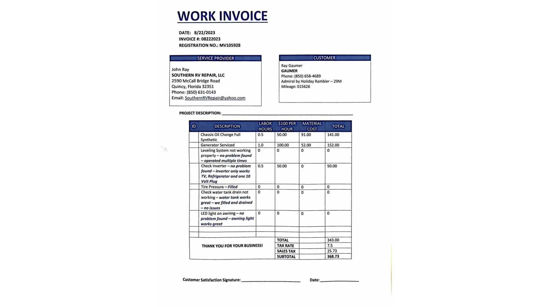 My Partner and I took delivery of a used RV on 5/12/2023. The delivery was delayed about a week for what was described as a leak repair in a leveling jack. we Live in Tallahassee Fl. and drove aprox. 3 hours to the dealership in Ocala to pick it up. Once at home we found many problems with the RV. The tire pressures were very low, half of power inside was off on generator, the oil indicator showed 11% oil life, the generator showed service due. and more small problems as well. It was obvious that none of these things were checked or they were ignored. I contacted our Business manager, Tray Hill and arranged with him to have the work needed done locally and General RV would reimburse me. After having the work done, I sent the Paid invoice to him for reimbursement. I have contacted him by email and phone (his mailbox is always full) I also left messages for him to please call me with no response. I am left with no other recourse but to write here and hope for a response. I will not use the Ocala store for service because of the condition of my RV. After spending well in excess of 100,000 dollars at this store, I am pretty sure I will not do it again, and will recommend to others not to either..