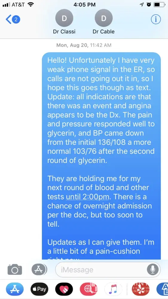 I returned to work the following day despite having tightness in my chest due to pressure from my employer to get back to work. I worked the full day on 21 and 22 august despite feeling fatigued and fell visibly ill on 22 august, as noted and remarked on by other employees. On the morning of 23 august I drove myself to university prompt care for continued tightness/pain in my chest/shortness of breath, and what was diagnosed as a severe respiratory infection likely related to my hospitalization at the va er on 20 august 2018, and related to my service in environmental hazard conditions in iraq in [protected]. This infection was highly contagious and rendered me unable to work on 23-24 august, 2018 under doctors orders due to severe coughing and vomiting exacerbating my chest pains. The doctor ordered me to rest for two days to prevent further cardiovascular complications with my heart and lungs.