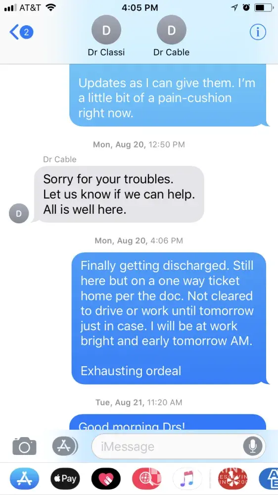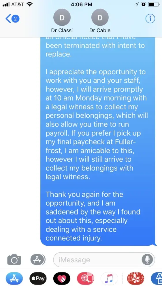Further evidence of his discriminatory practices, dr cable cites that he found a draft file copy of a resignation letter dated 22 august 2018.in this draft for my eyes only, I cited that my reserve unit is set to mobilize in fy19 and that I would like to consider (at the time) a resignation date effecting september 7, 2018. This letter was in my personal files, not intended for communication until a later date, not signed by me, and not sent, printed, or communicated to dr. Cable in any form or fashion. During the period of when I was under emergency medical care, dr. Cable decided to "discover" this document and further show his discrimination against military members and families by using my reasons of a fy19 mobilization as a reason to immediately expedite my termination and replacement (proof in text/email form from dr cable), thus not allowing me to work even the proposed (draft) intent of working until september 7, 2018.