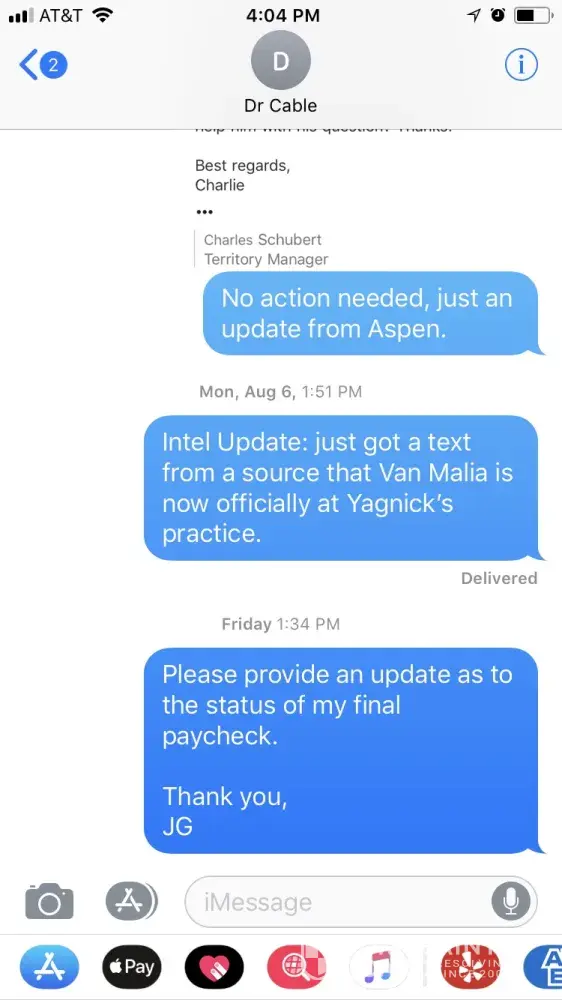 In the end, my termination was the result of a hostile work environment, retaliation for making a formal osha complaint, and persistence in trying to be state a federally compliant. I see this termination as punitive, and this is further evidenced by my employer refusing to give me my final paycheck as aforementioned. (dr. Cable did withhold the previous practice manager's paycheck for months out of punitive feelings toward her, so there is precedent for this, and cause for my concern). I have also not received the required dol form 800 required by georgia code 34-8-190, thus I am unable to file for unemployment properly.