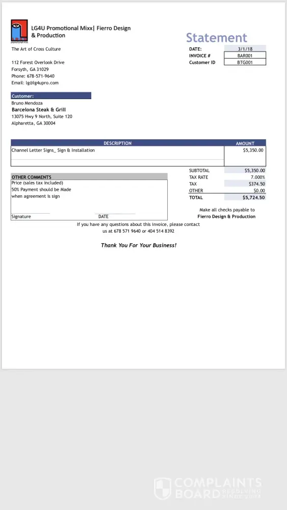 This company is operating in georgia with out gl insurance, workers compensation and any type of lisence. (installing heavy business signs, decals, etc). They don't want to provide me with a tax id number so I can report all the payments made to them (over 10k). Fierro design and promotion is a company based in florida and he don't have any authority to work in georgia.