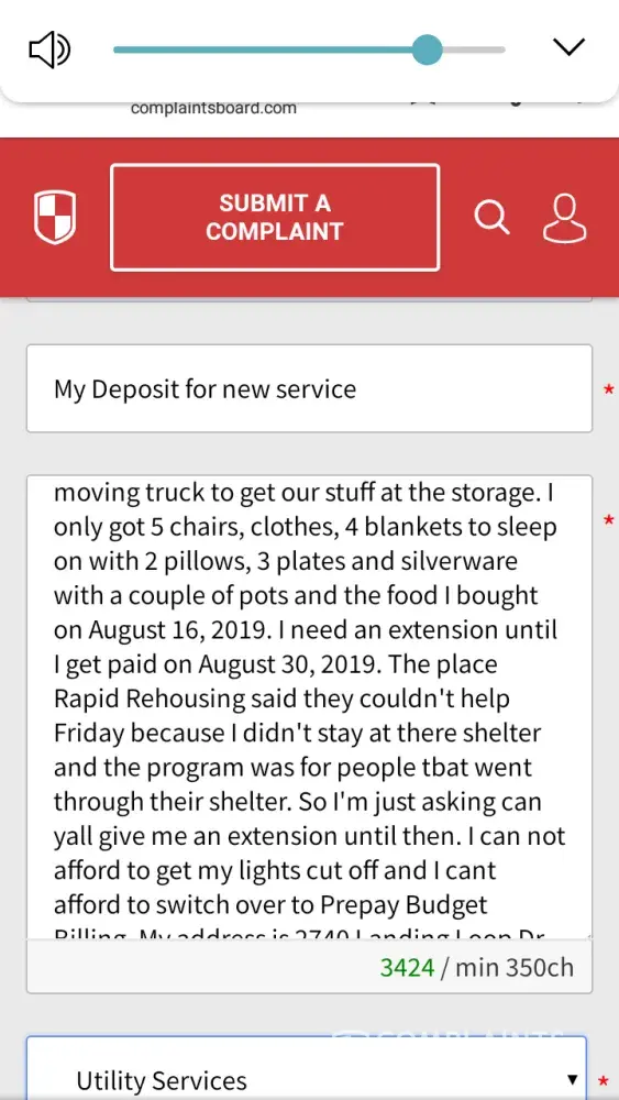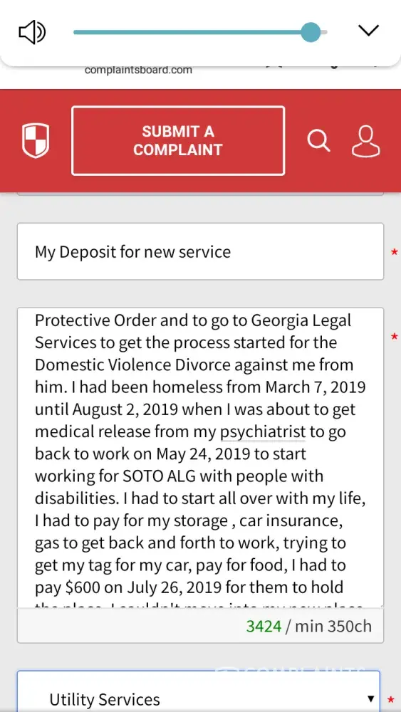 Hello my name is Sharon Gant-Wadley, I currently just move to 2740 Landing Loop Dr. Augusta, Ga. 30904. I previously lived at 2334 Happy Circle Rd. Augusta, Ga. 30906 and I moved from there on March 7, 2019. I couldn't afford to stay there anymore because I had resigned from work January 3, 2017 and my ex husband was the only one that had income coming in. My son and I was homeless from March 7, 2019 until August 2, 2019. I'm currently going through a domestic violence divorce. I had to go through Safe Homes a place for domestic violence victims and they helped me to get a Temporary Protector Order against him for the assault that he did to me. He is currently is in prison for the assault against me. I just got a medical release from my doctor to return back to work. I suffer from PTSD, bipolar, depression, anxiety and a victim of domestic violence. I'm greatful that I found a place for my son and I to stay in. I had got a refund for my deposit in April 2019 or May 2019 for $355.00. I had paid my deposit for $150 July 23 or 26 2019 through my bank and gotten a confirmation thinking that it went through but i received a letter last week saying that my bank returned the check and that you all adding an additional $30 plus $30 for the first bill and the $150 deposit totally $210.00. I'm just asking could you give me an extension until I get paid on August 30, 2019. When I got paid on August 16, 2019 I had to pay my car insurance $204 so I could get back and forth to work, pay an old waterbill for $675.38 so that I can have the water transferred into my name to move in so that was my whole check right there. I couldn't get a Uhaul truck to get our belongings out so my son and I are sleeping on the floor with our blankets, 2 pillows, 5 chairs, a few groceries and a tv. Our beds, furniture and everything else is still in the storage until I can get a Uhaul truck. I'm asking could you all give me an extension until August 30, 2019 when I get paid. I can't afford to have my lights turned off because I can't afford another deposit. Thank Sharon Gant Wadley [protected] or [protected]