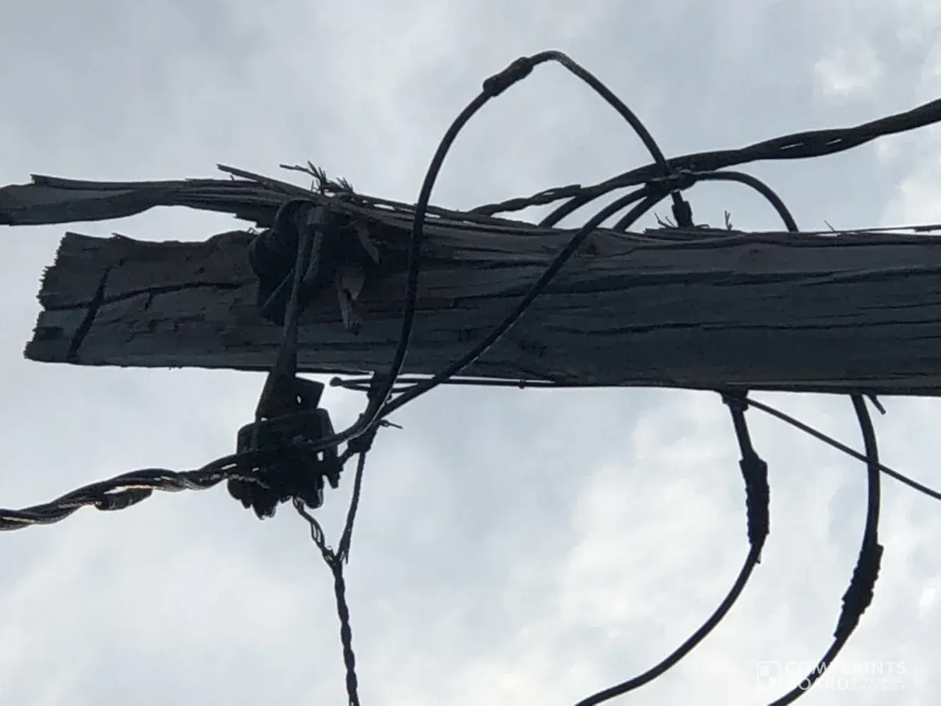 A storm knocked a tree down which in turn tore down the power line and damaged the pole. A lineman repaired and anchored the power line back to the pole but informed us that the pole was split, unsafe and needed to be replaced. At this time we've made numerous calls and complaints but the problem still hasn't been resolved. The pole has split further and the live power wire is barely hanging on overhead, where we walk, drive and our kids play every day!