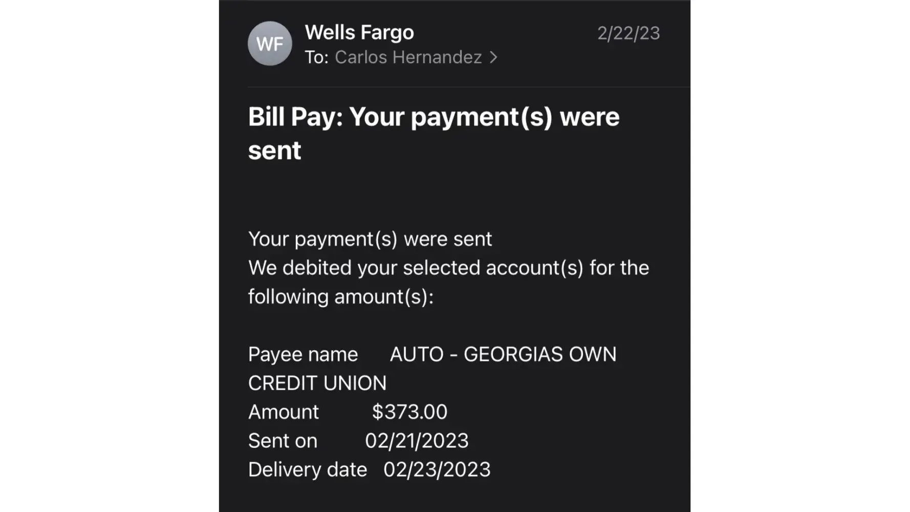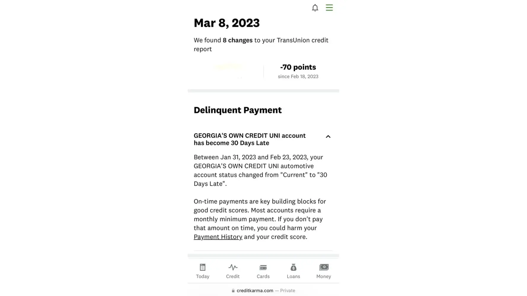 However, accidents do happen. In February 2023 a notice dated 02/15 was mailed to me by Georgia's Own Credit union advising I had a past due amount on my loan (partial payment) for $160. When I received the notice on 02/21/23, I immediately reviewed my account and remitted a payment for the entire payoff balance from my Wells Fargo Checking account ($373). Credit Karma confirms this as it reflects my account was reported with a $0 balance, however they also show that between 01/31/23 and 02/23/23, Georgia's Own reported my account as delinquent to the credit bureaus, which dropped my overall credit score 69 points. I have not had a delinquent payment in my credit history since my early 20's and did not know this balance existed. I remitted payment in good faith immediately for the full balance on the account. After initially speaking with a representative via phone at Georgia's own named Amanda, she told me there was nothing that could be done on their behalf. I do not believe this to be true and find it very polarizing that a credit union that I have a line of credit, auto loan, checking AND savings account is unwilling to assist me in clearing an honest mistake.