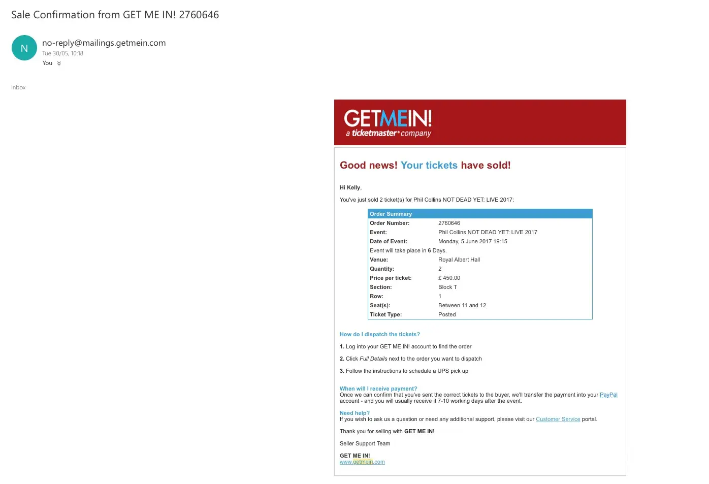 I received an email from GETMEIN stating the tickets had been sold on Tuesday 30/05/17 at 10:18. I logged into my account to find the postal address 2 Fridtjof Nansenstei Norway. I tried to call through to GETMEIN more than 15 times but received the message the lines are busy please try again later. Therefore I had no choice but to go to the post office and send the tickets but as the tickets that GETMEIN had sold to an overseas address there was no way that Royal Mail could record the delivery, all they could was record the post in the UK then get the tickets signed for at the other end.