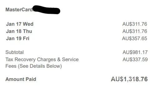 I can understand that some of these booking companies charge a “booking fee/tax†but the excessive additional AU$337.59 were not mentioned anywhere in the transaction process. These undisclosed fees are illegal.