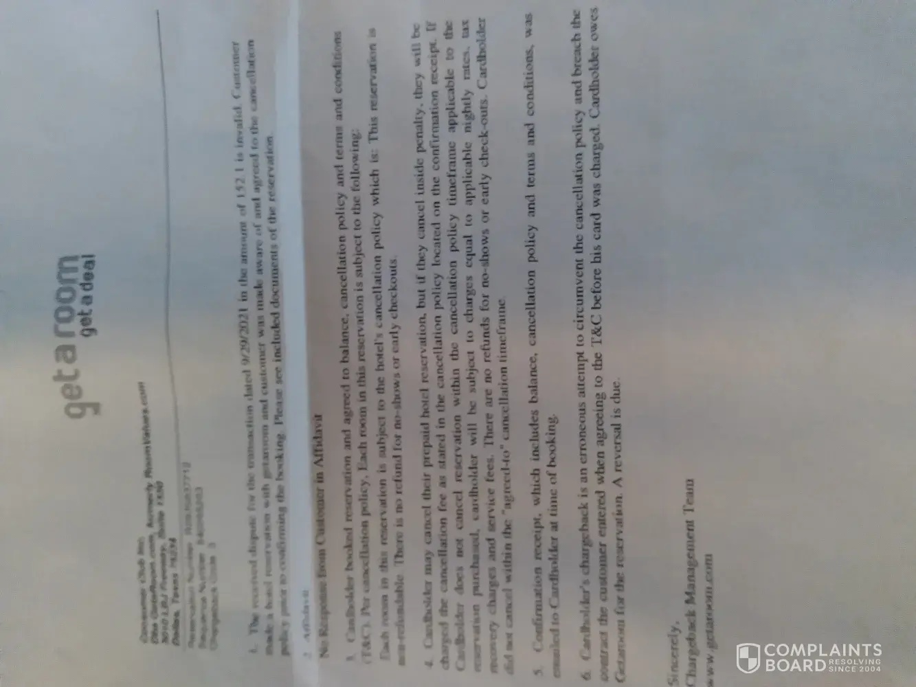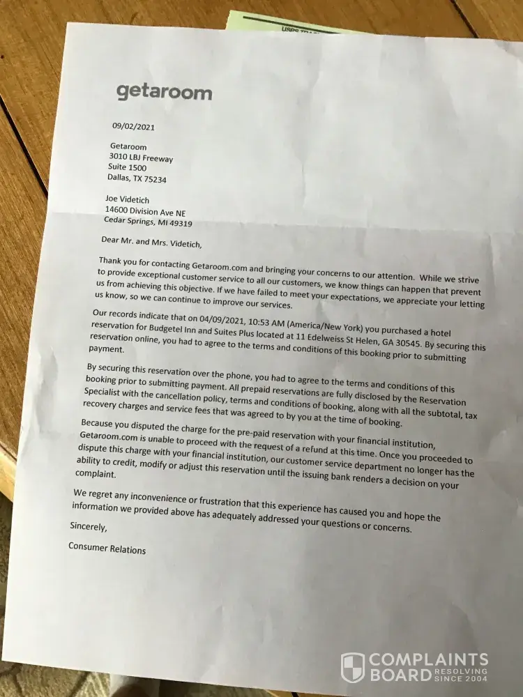Paul, We have provided a resolution regarding your review and an email has been sent to you directly detailing this information. On behalf of the entire Customer Service department with Getaroom, we thank you for your feed-back and apologize for any confusion and inconvenience this may have caused you. We take our customers’ reviews very seriously, and we’d like to thank you for updating your star rating for your customer service experience on ComplaintsBoard.