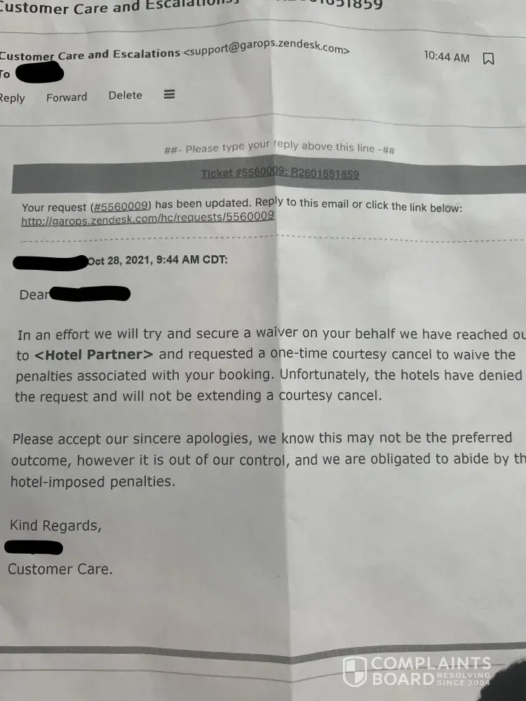 Getaroom is requesting that we remove the rep's contact info that provided the poor service to us in order to move forward with a refund for me. I have tried to edit this complaint but cannot figure it out. Could someone please assist in removing the rep's information? I submitted a contact form request as well with a new image of the email we received which has the rep's info redacted. Thanks!