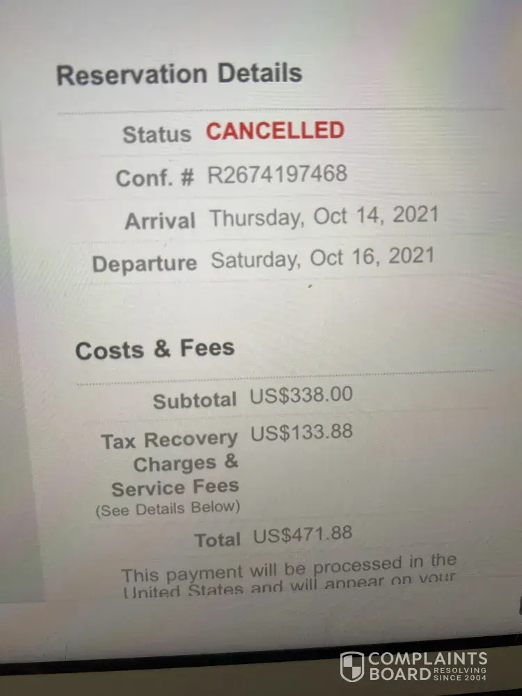 I have examined your business practices on the internet and see that there are many complaints against you with the BBB and that you are currently being sued by a California couple for the same unethical practices. I have cancelled my reservation and you have not refunded me for the $1, 401.92 you charged me. I want a full refund and will be taking you to small claims court and processing a complain with my bank if not.