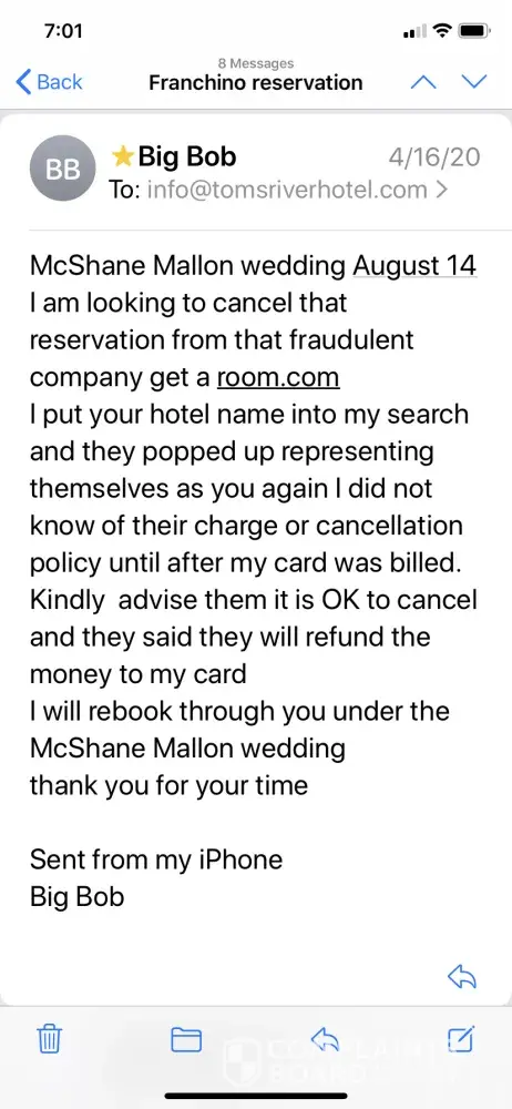 I went online to book a room for the days hotel toms river new jersey for a wedding I typed the hotel name and was fortunately sent to get a room website I made my reservation thinking I was dealing with the hotel directly. Upon my payment being processed a new amount appeared that was charged to my credit card and all of a sudden get a room made their presence known by the $200 plus an extra fees and three to four pages of rules and regulations.