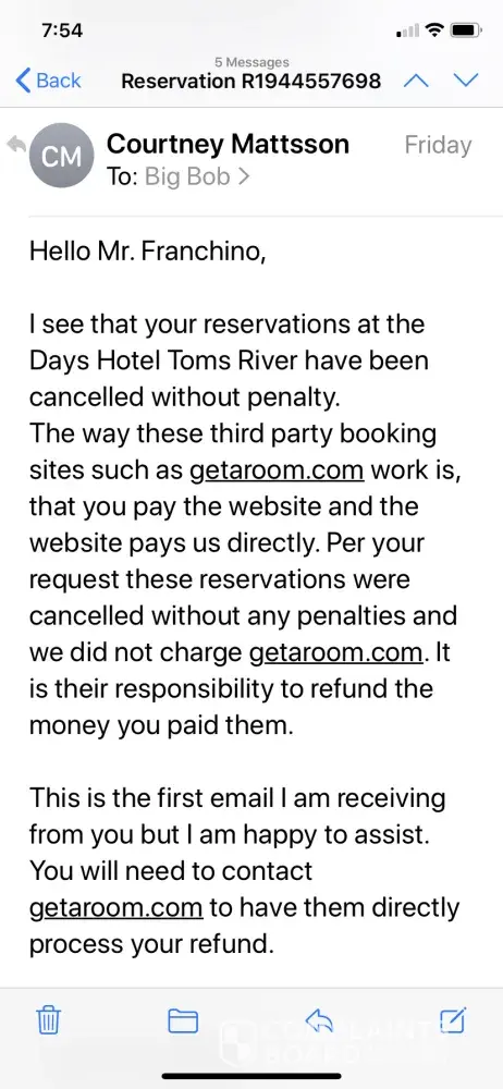 When I originally booked, I thought I was on the hotel website - it was deceptively created to look like I was booking directly with the hotel, which was my intention. The booking email confirmation came from [protected]@hotelvalues.com, and when I searched it, the site can't be reached. There is an effort to hide the fact that you have booked with Getaroom. The only way to know is by looking at your credit card statement to see where the charge comes from. I would like to hear back from the company and receive the refund as promised.