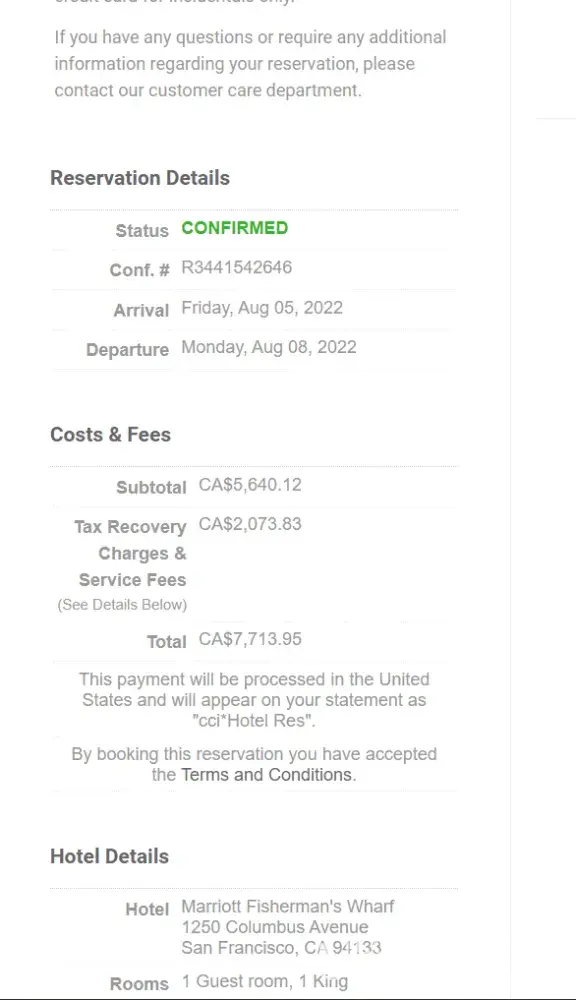 My wife booked us 3 nights at the SF Marriott Fisherman's Warf for August 5-8, 2022. When she sent me the confirmation code today, I fell out of my chair. $1800 USD per night. I was just on the Marriott website and it was only $330 USD per night. I booked directly with the hotel and asked her to cancel with getaroom.com. When she spoke to getaroom.com, they told her she needed to cancel before 5/25, 2 days prior to making the booking. How is this possible? She now has a pending $7800 charge on her credit card. BBB and all other online review indicate you should NEVER, under ANY circumstances, do business with getaroom.com.