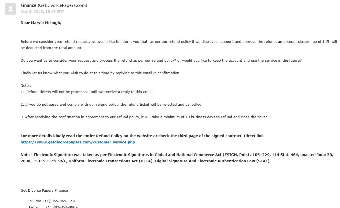 Hi my name is Dawn Evans... [protected], [protected], [protected]@Gmail.com... Pray To Hear From You... I filed the paperwork and paid the $129 + fees in 2015. It took me 7 hours to complete the forms. It was taking GetDivorcePapers.com far to long to get back to me. I called and spoke to someone about a refund. It wasn't settling correctly in my stomach or mind due to the time they started to take once receiving my money. They were in constant contact and capable of being reached until that point, for any Q&A. I had to reach out to an Alliance that would try to retrieve my refund and they couldn't reach them. Their initial refund guidelines just stated 100% GUARANTEED. When FINALLY reaching someone at GetDivorcePapers.com, I was told of a, I'm quite certain, 60-90 day refund guideline. I explained that even though it took so long to reach them. I'm still eligible for the refund. I had to explain to them that I no longer at internet for some time. I had been told, "You need to sign into your account and opt for the refund.". It was stated AGAIN that the internet was down and that was impossible. Here I am 2018 and still never refunded. The Alliance I had spoken to also stated after a few months that they couldn't reach them either. If I heard from GetDivorcePapers.com to reach out to the Alliance again. Again, once opting for a refund they were no longer reachable. Their number, e-mail for support... [protected]... [protected]@GetDivorcePapers.com.