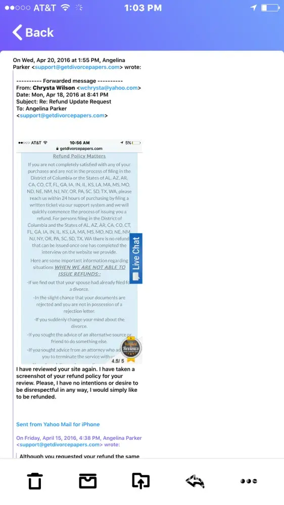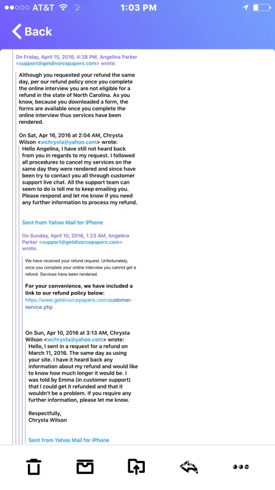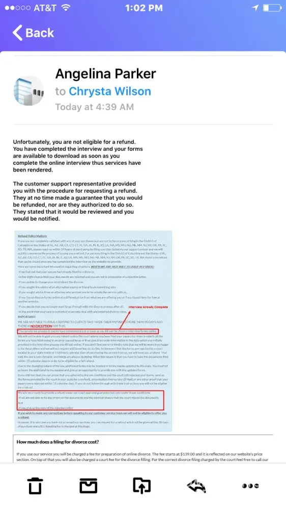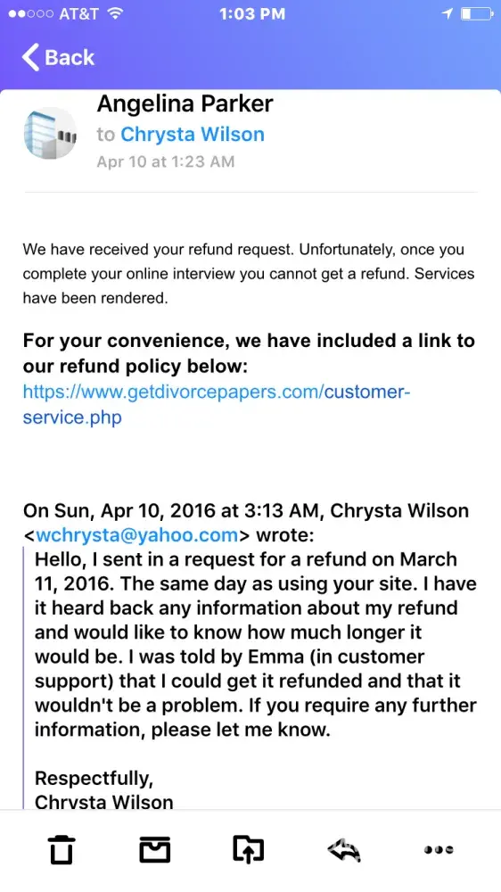 The divorce papers obtained from GetDivorcePapers.com were rejected from court. When emailed GetDivorcePapers.com regarding a refund [protected] Ticket Number 720995) I didn't receive a reply until I finally mentioned that I will file a consumer report. Angelina Parker, Director of Support Service, replied in one line "Please provide us with a copy of the packet you received and we will issue you a refund" [protected]). I sent the copy but I still did not get a refund or an email with an update. I wrote a final email today regarding the rejection of "Marital Settlement Agreement" by court.