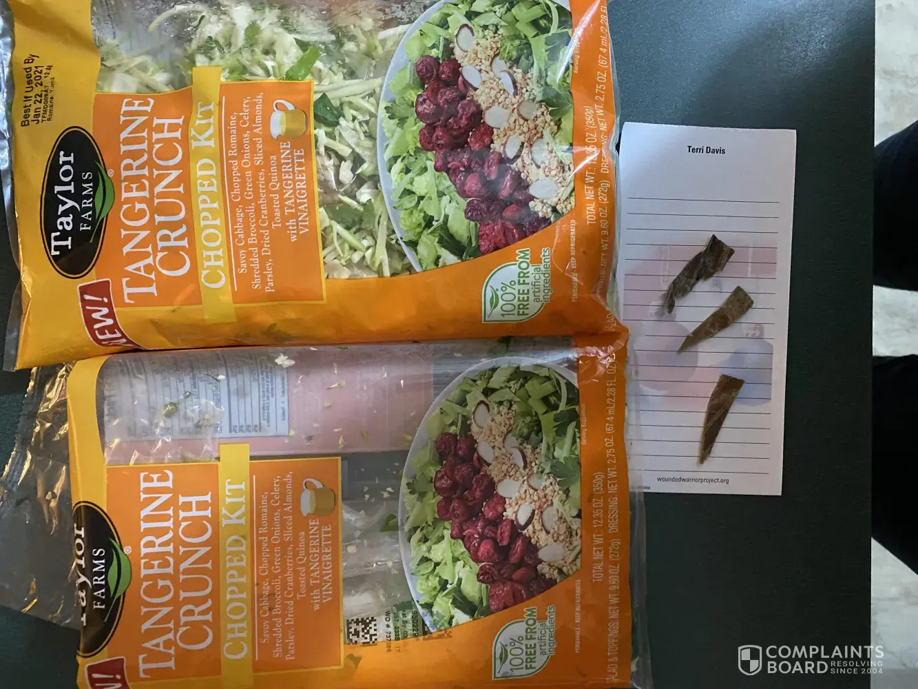 I purchased 2 bags of taylor farms chopped salad kits adding everything to the bowl and eating I bit into something hard and sharp. I still can't imagine what it is, I have emailed taylor farms with all the information and would like to know what I put in my mouth. This could cut and or choke someone. Purchased at giant in pasadena, md