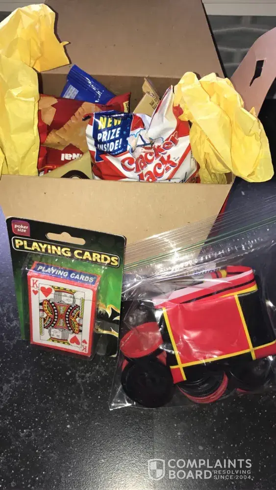 If you compare that to what was actually sent ( see picture attached ) A pack of playing card a cheap bag (not boxed) of checkers and 4 pack of sweets.