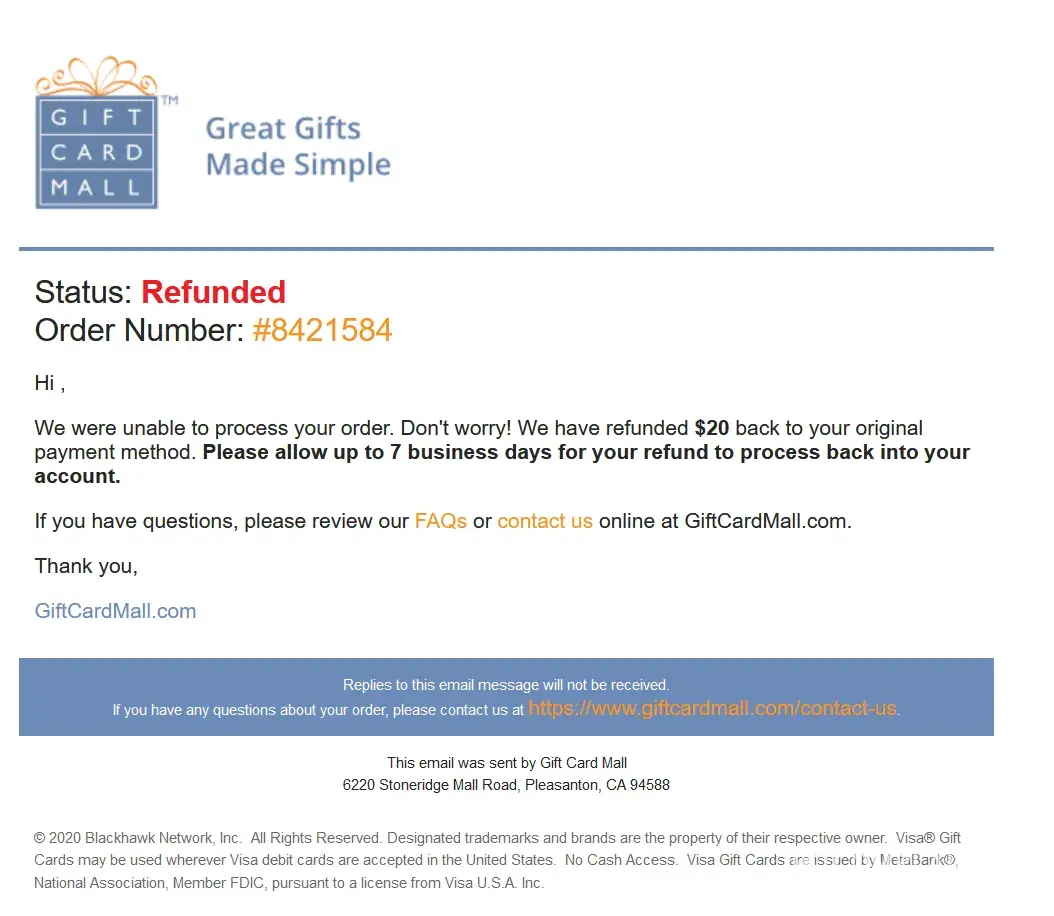 I had a very bad experience with this company Gift Card Mall and had the same problem like many others. I placed my order for three gift cards and they charged my card. After my order was competed and they received the money they cancelled my order! They did not contact me or anything, they simply cancelled my order and stole my money. Gift Card Mall never replied to my messages and I have no idea how to get my money back and according to all the reviews there is no way to get a refund! Avoid like a plague!