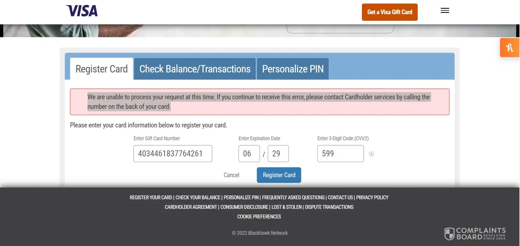 1. Every attempt to register a card on GiftCardMall.com has the following error when submitting the card registration form: "We are unable to process your request at this time. If you continue to receive this error, please contact Cardholder services by calling the number on the back of your card."